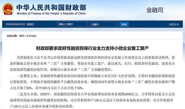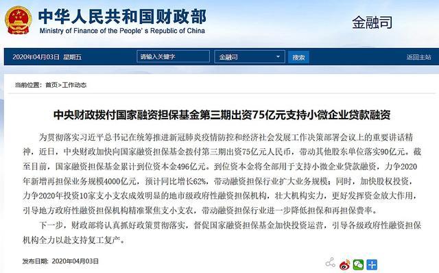 据财政部网站3日消息,中央财政拨付国家融资担保基金第三期出资75亿元支持小微企业贷款融资。同时,财政部要求政府性融资担保行业全力支持小微企业复工复产。