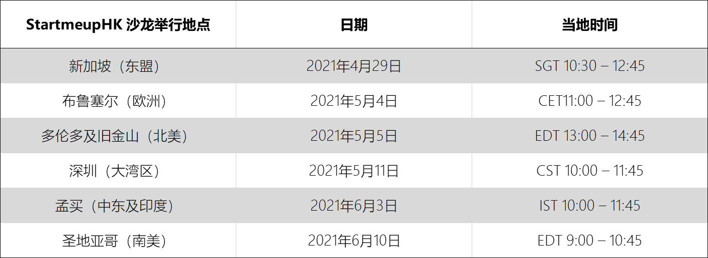 每个地区的沙龙活动将有不同主题,贴地讨论当地热门初创议题,同时就以下几个范畴进行小组讨论: