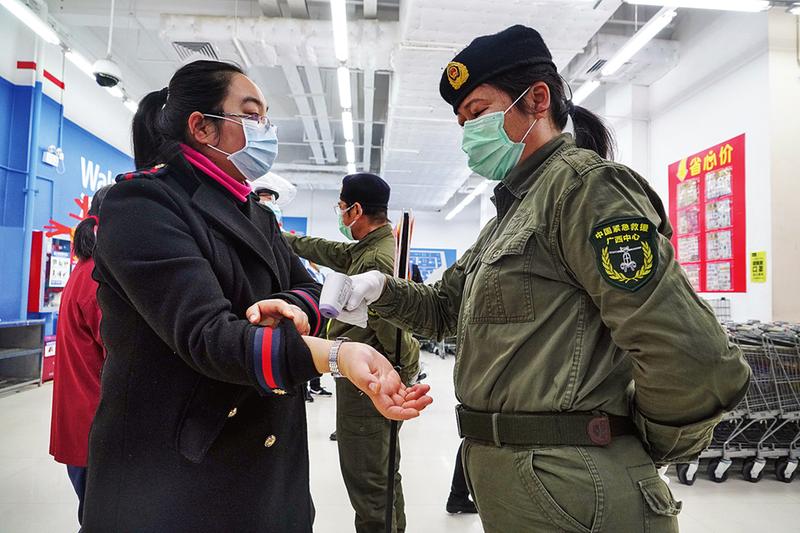 在超市入口,广西紧急救援促进中心志愿者李萍正在为市民检测体温。
