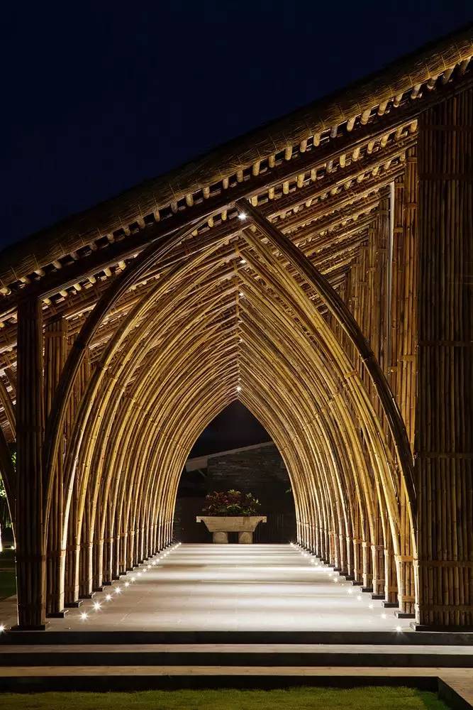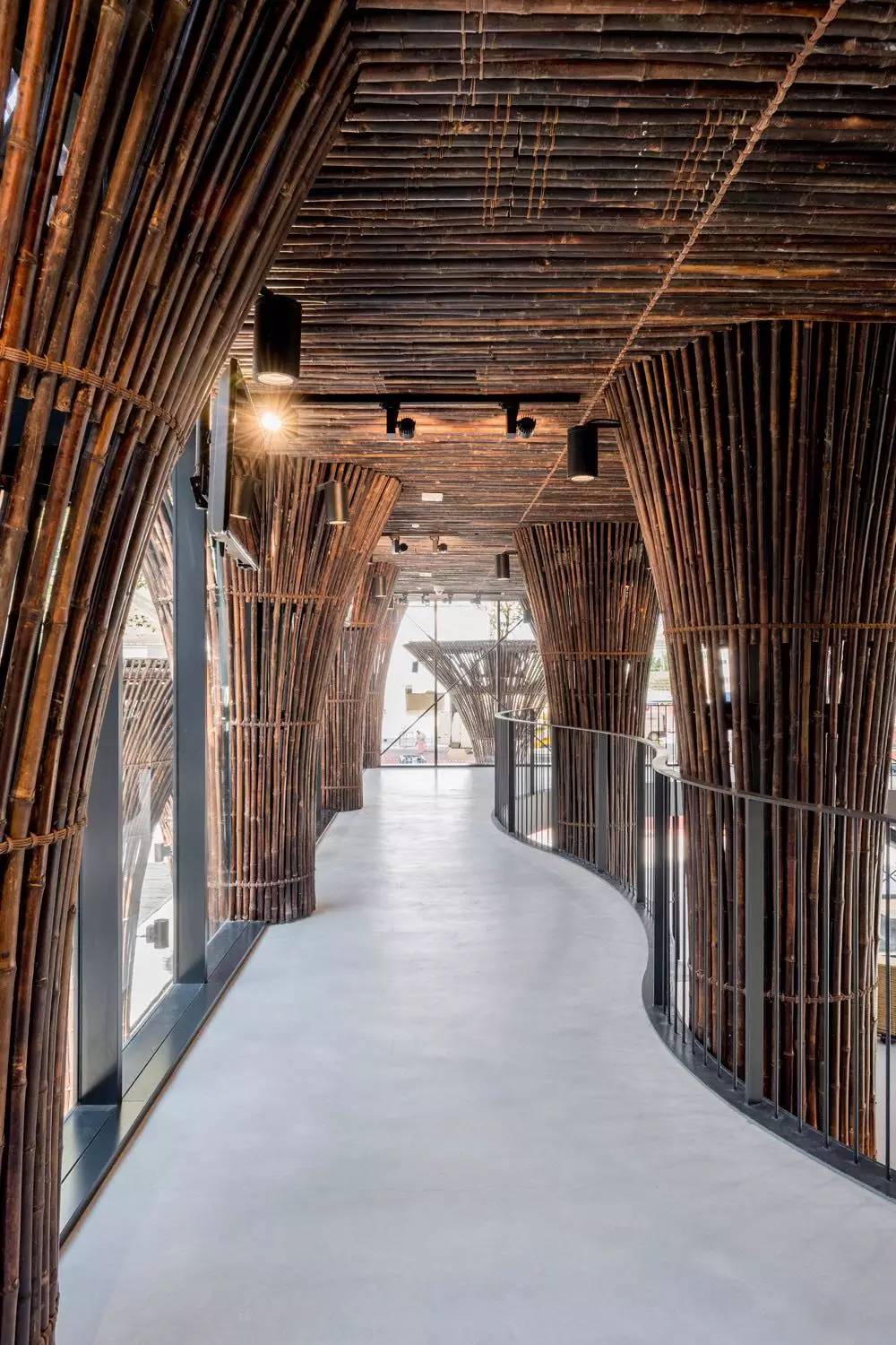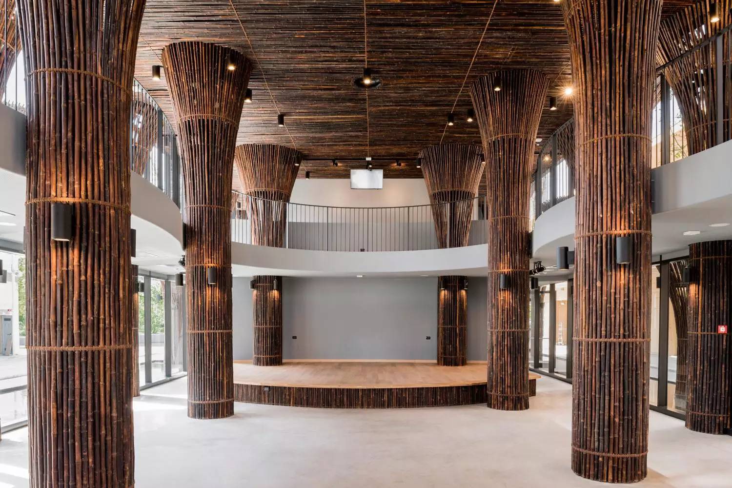 在这个项目中他首次加入了玻璃、钢材等现代材料,让整个建筑具有足够的功能性同时又不失去竹子结构的灵巧。主结构框架全部使用竹子打造,大厅跨度为13.5米,走廊4米,屋顶高度9.5米。通过弯曲竹子形成了类似拱形的外观,并且与结构相连。而且,凹进的玻璃立面同时用作门厅的玻璃外墙。