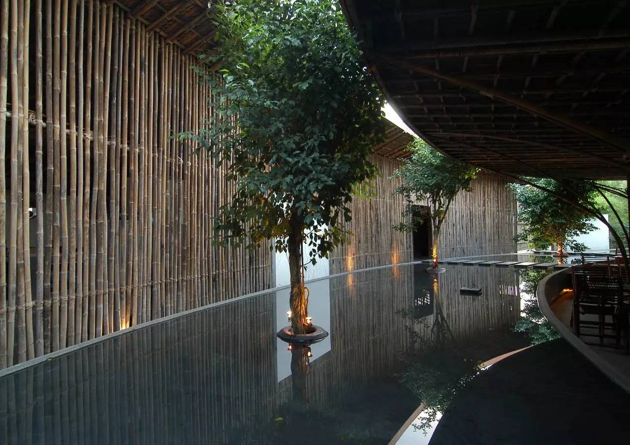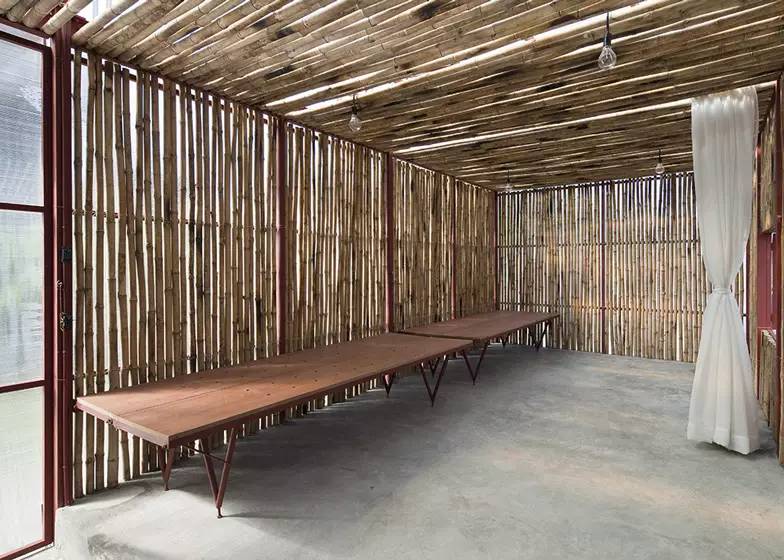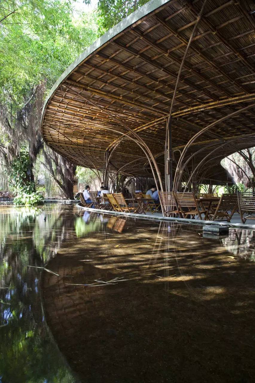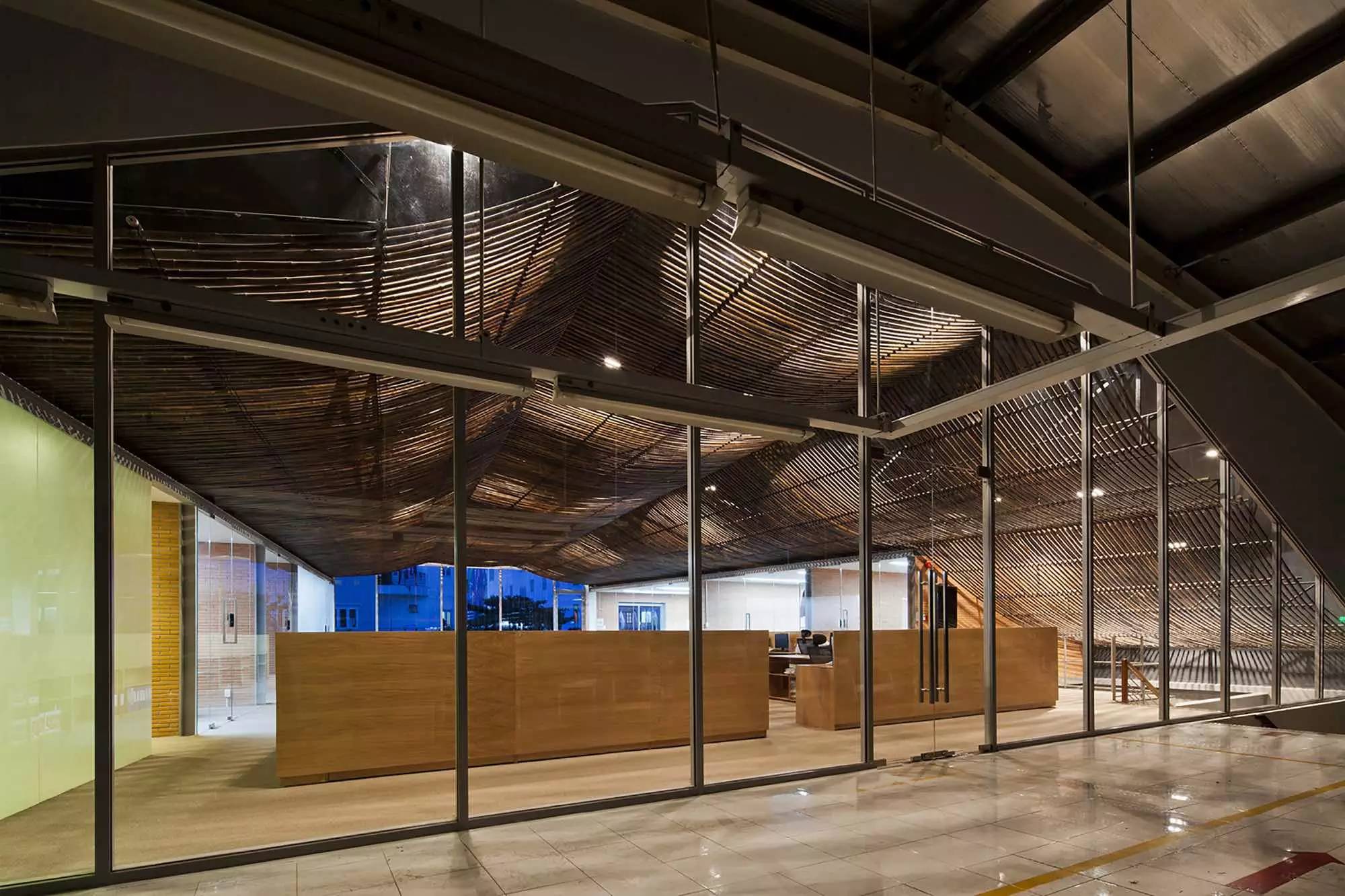 在这个项目中他首次加入了玻璃、钢材等现代材料,让整个建筑具有足够的功能性同时又不失去竹子结构的灵巧。主结构框架全部使用竹子打造,大厅跨度为13.5米,走廊4米,屋顶高度9.5米。通过弯曲竹子形成了类似拱形的外观,并且与结构相连。而且,凹进的玻璃立面同时用作门厅的玻璃外墙。