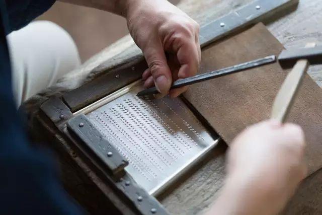 在镀锡的铜板上一边移动,一边敲打,很快就凿出一排整齐的三角形齿孔。