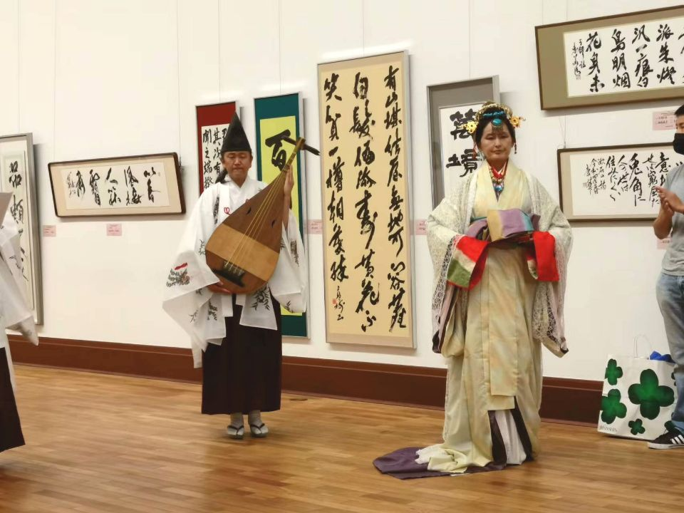 随后,由日本神职人员表演的“杨贵妃”身着和式贵妃服装登场。一把久远的古式琵琶,一声低吟,琴声回绕,声声慢,凄凄然,远古通幽,凄美表心 ,拨触于指尖,仿佛千年前穿越到日本的杨贵妃,至今仍梦魂萦绕、冥铭牵挂着大唐至尊的唐玄宗李隆基,手拿折扇,表情凝重,端端凝视着大唐古都西安……。