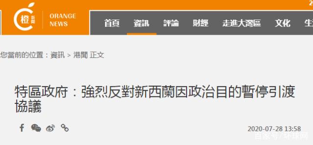 新西兰外长彼得斯(Winston Peters) 28日宣布,暂停执行与香港的引渡协议,并在其他对港措施方面作出修改。香港“星岛网”“橙新闻”报道称,特区政府对此表示强烈反对。