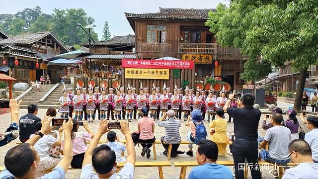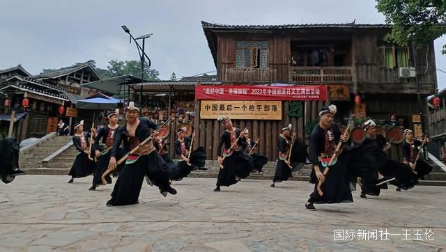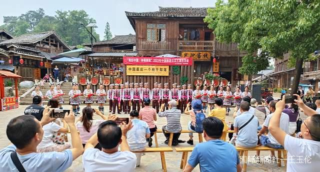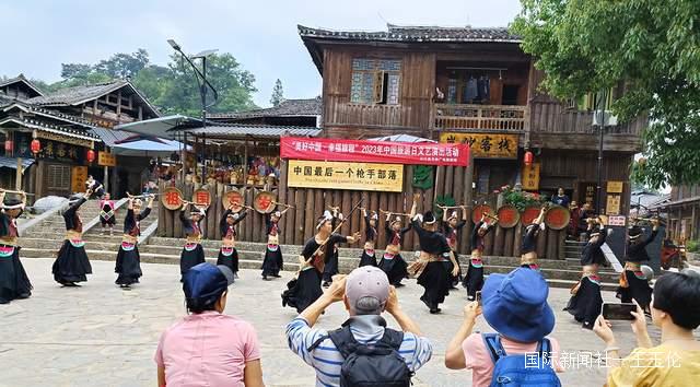 5月19日,贵州省从江县岜沙苗寨旅游景区格外热闹,一场主题为“美好中国·幸福旅程”的原生态民族文化展演正在举行,来自四面八方的游客和当地群众欢聚在一起,兴高采烈地观看演员们表演的精彩节目,共同庆祝第十三个“中国旅游日”。