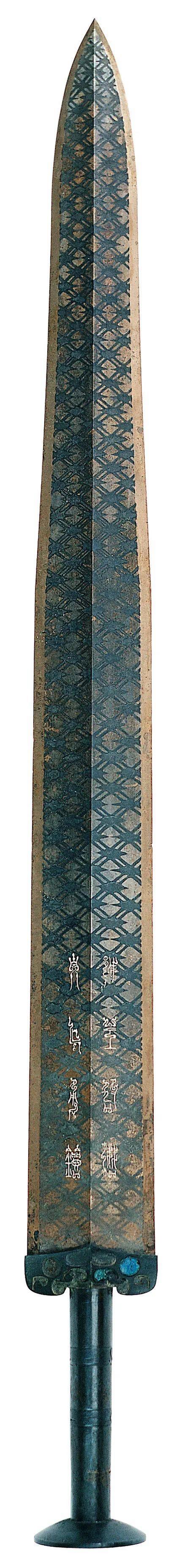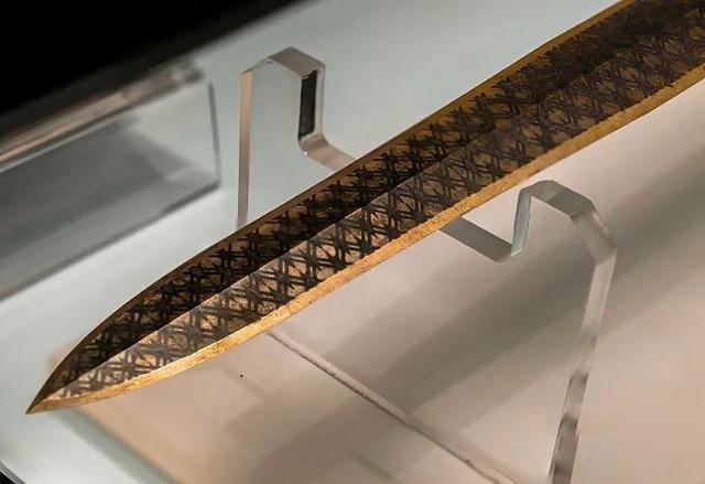 春秋战国时期,出土的许多宝剑都有菱形暗格花纹,这种技术是当时比较流行的制剑工艺。勾践剑的剑身也遍布这种花纹,经过硫化处理,可以防止锈蚀,从而保持花纹艳丽。
