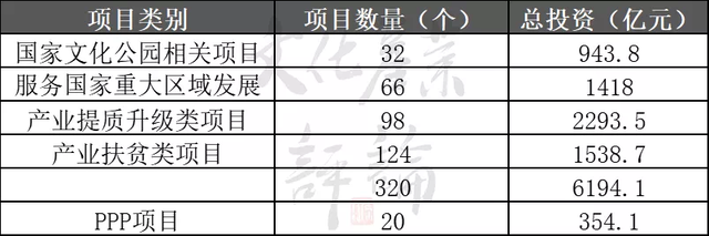 按投融类别可分四大类,其中,国家文化公园相关项目32个,总投资943.8亿元;服务国家重大区域发展战略类项目66个,总投资1418亿元;产业提质升级类项目98个,总投资2293.5亿元;产业扶贫类项目124个,总投资1538.7亿元。遴选出的320个项目中,PPP项目20个,总投资额354.1亿元,占项目总量的6%。