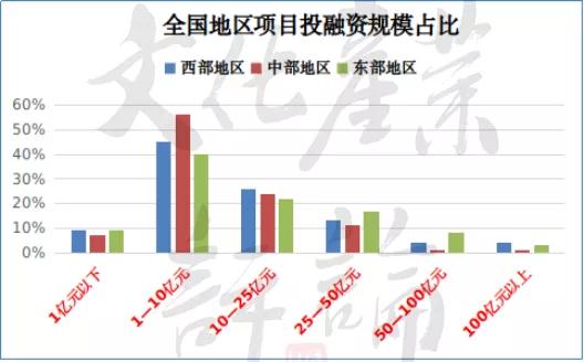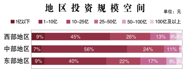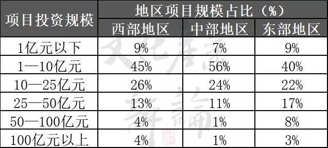 从项目投资规模看(见下图),西部地区1亿元以下占比9%,1亿元至10亿元之间占比45%,10—25亿元占比26%,25—50亿元占比13%,50—100亿元及100亿元以上占比分别为4%;中部地区1亿元以下占比7%,1亿元至10亿元之间占比56%,10—25亿元占比24%,25—50亿元占比11%,50—100亿元及100亿元以上占比分别为1%;东部地区1亿元以下占比9%,1亿元至10亿元之间占比40%,10—25亿元占比22%,25—50亿元占比17%,50—100亿元占比8%,100亿元以上占比为3%。