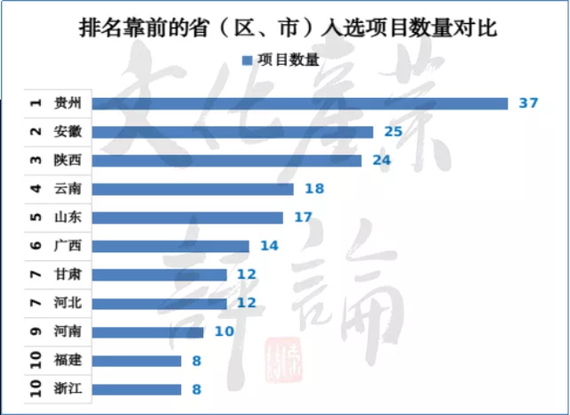 从西部地区入选项目数量看,除了贵州(37个)、陕西(24个)、云南(18个)位居全国前五、名列西部前三外,广西、甘肃、青海省等西部省(自治区)入选的文化和旅游项目同样占据一定的区域资源优势。