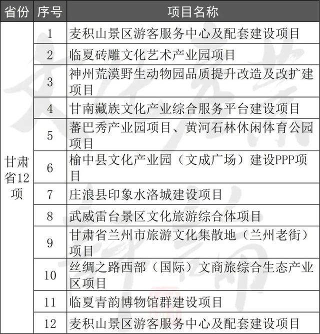 再如,甘肃省入选的文旅项目包括了麦积山景区游客服务中心及配套建设、临夏砖雕文化艺术产业园、蕃巴秀产业园、黄河石林休闲体育公园、榆中县文化产业园(文成广场)建设、庄浪县印象水洛城建设、武威雷台景区文化旅游综合体、兰州市旅游文化集散地(兰州老街)、丝绸之路西部(国际)文商旅综合生态产业区、临夏青韵博物馆群建设等12个项目。