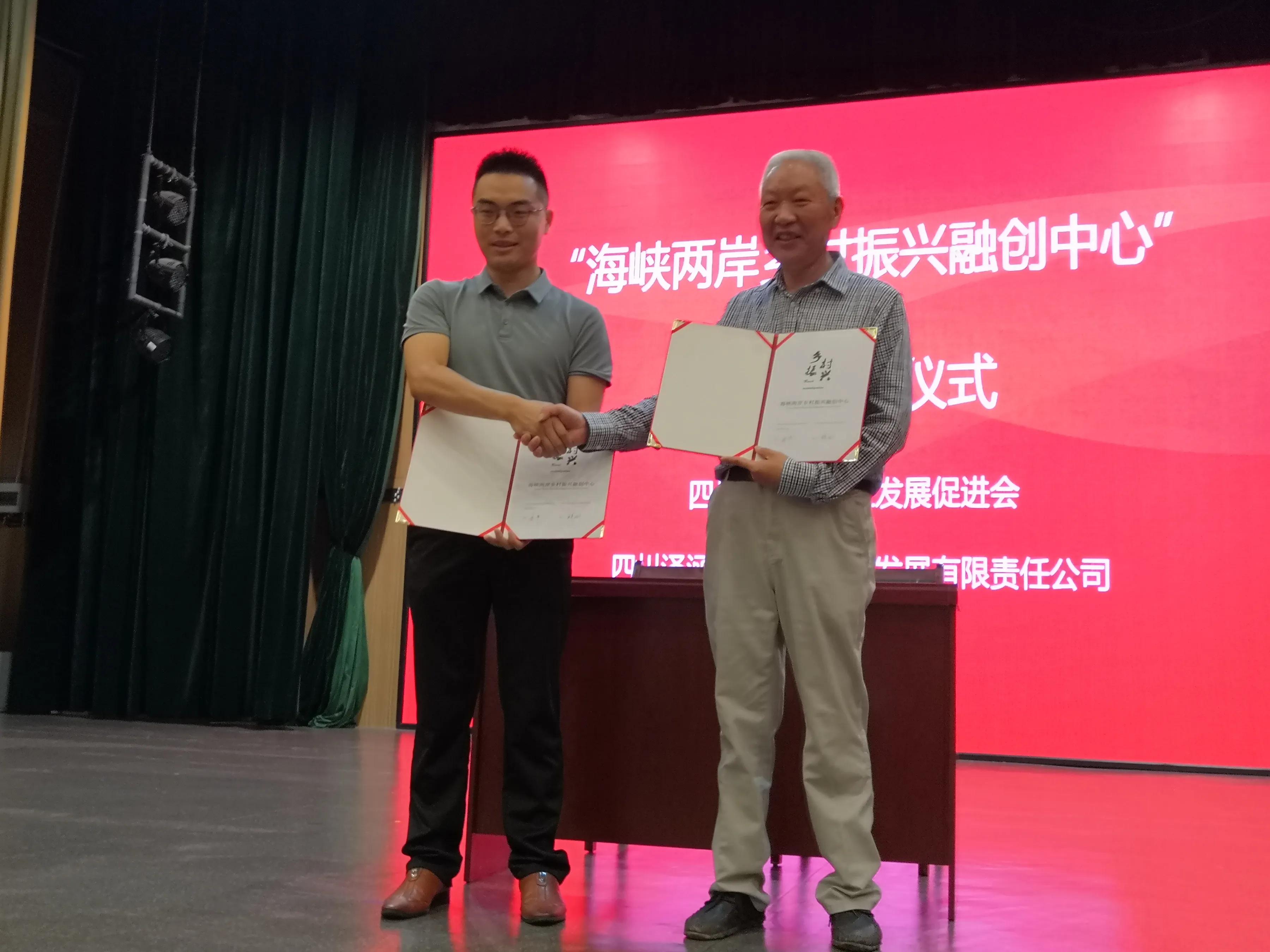当天,四川省生态农业发展促进会乡村振兴研究中心成立举行了仪式,四川省生态农业发展促进会秘书长鲜钢分别向四川聂氏农业科技有限公司、四川泽涵明远农业科技发展有限责任公司授牌,举行了“乡村振兴研究中心龙泉驿工作站”的授牌仪式,及“海峡两岸乡村振兴融创中心”合作签约仪式。