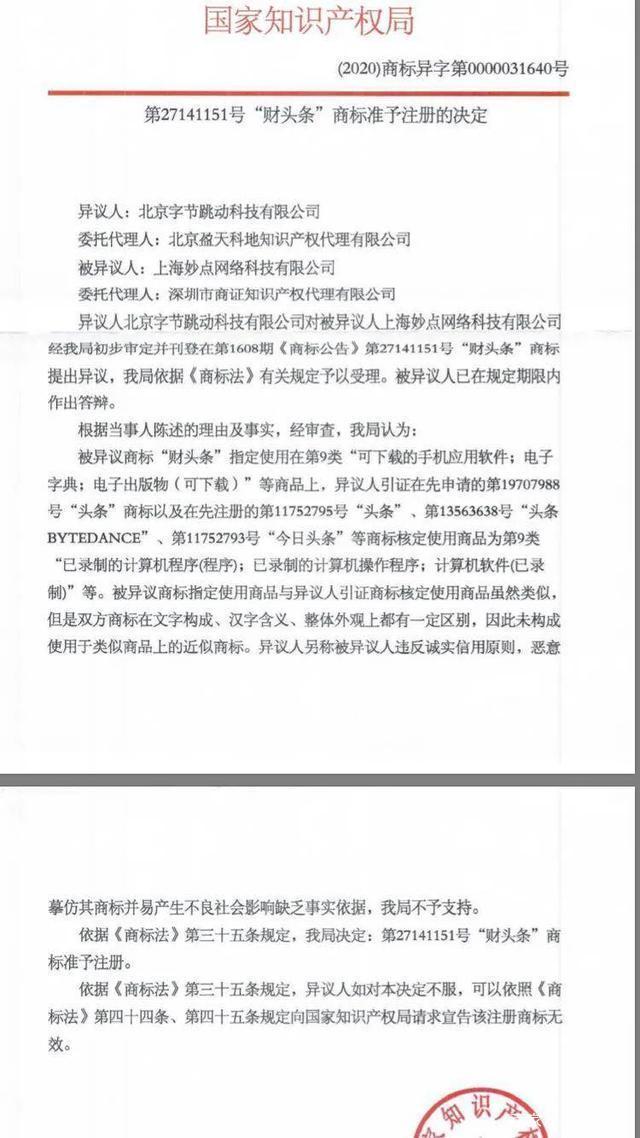 对妙点科技的商标提出异议的是北京字节跳动科技有限公司(简称“字节跳动公司”)。异议人字节跳动公司引证,“财头条”与其在先申请的“头条”、“今日头条”等商标类似,但是国家知识产权局认为,上述双方商标在文字构成、汉字含义、整体外观上都有一定区别,因此未构成使用于类似商品上的近似商标。上述文件显示,字节跳动公司另称妙点科技公司违反诚实信用原则,恶意模仿其商标并易产生不良社会影响,国家知识产权局认为缺乏事实依据,不予支持。