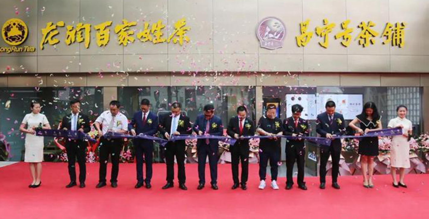 贺靖副书记、焦少良副董事长、何文董事、高众总裁、许耀南总裁、詹胜姣副总裁、张福祖副总裁、黄浩副总裁、邵正总经理、刘杰CEO一同上台,携手为“龙润百家姓茶&昌宁号茶铺双品牌旗舰店”开业剪彩,共同切下开业蛋糕,共同祝愿双品牌旗舰店开业大吉,生意红红火火。
