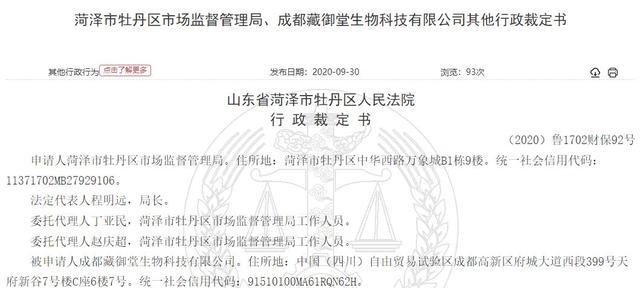 山东省菏泽市牡丹区人民法院行政裁定书((2020)鲁1702财保92号)显示,申请人菏泽市牡丹区市场监督管理局在查处被申请人成都藏御堂生物科技有限公司涉嫌传销一案中,为防止被申请人转移或者隐匿违法资金,申请人菏泽市牡丹区市场监督管理局于2020年8月20日向法院提出申请,申请冻结上列被申请人成都藏御堂生物科技有限公司及法定代表人顾冰洁等25位涉案自然人在金融机构的存款、理财、期货等财产。如财产保全有误,申请人愿承担一切法律责任。