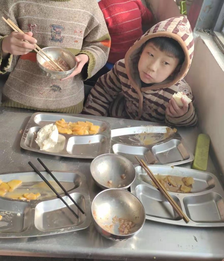 来到学校餐厅,此时老师和学生们正在进行午餐。记者随机看了一下餐桌上学生吃空的餐盘并问了一个学生,得知今天中午一菜一汤(土豆片、八宝粥),菜里少许加点火腿肠。
