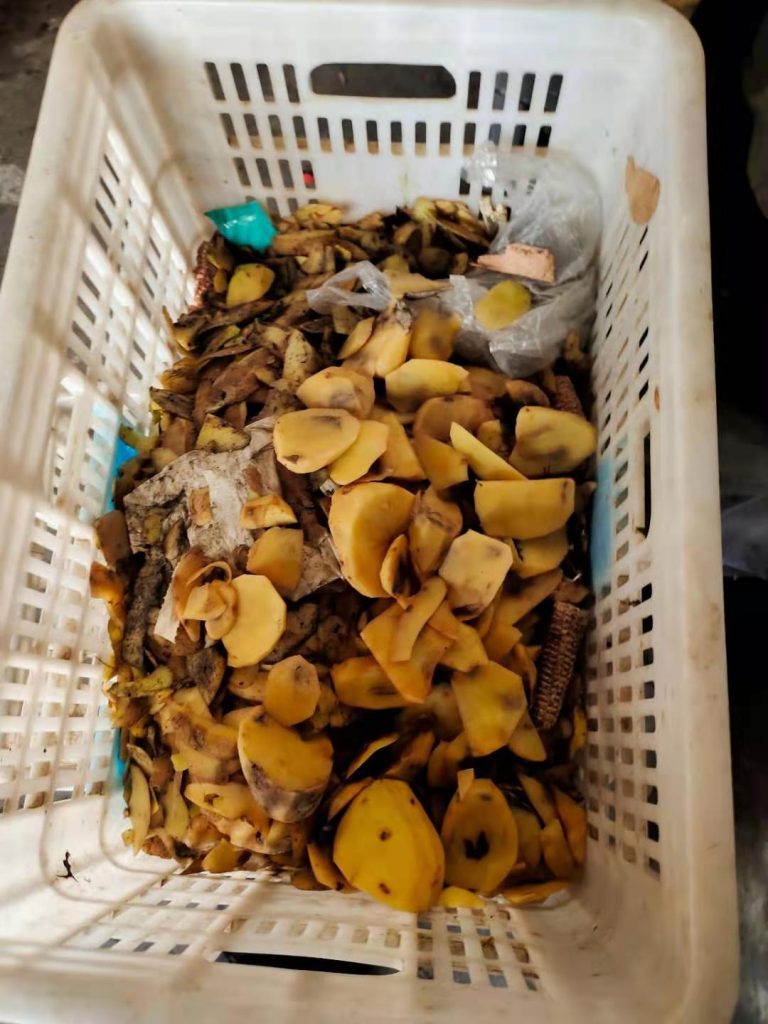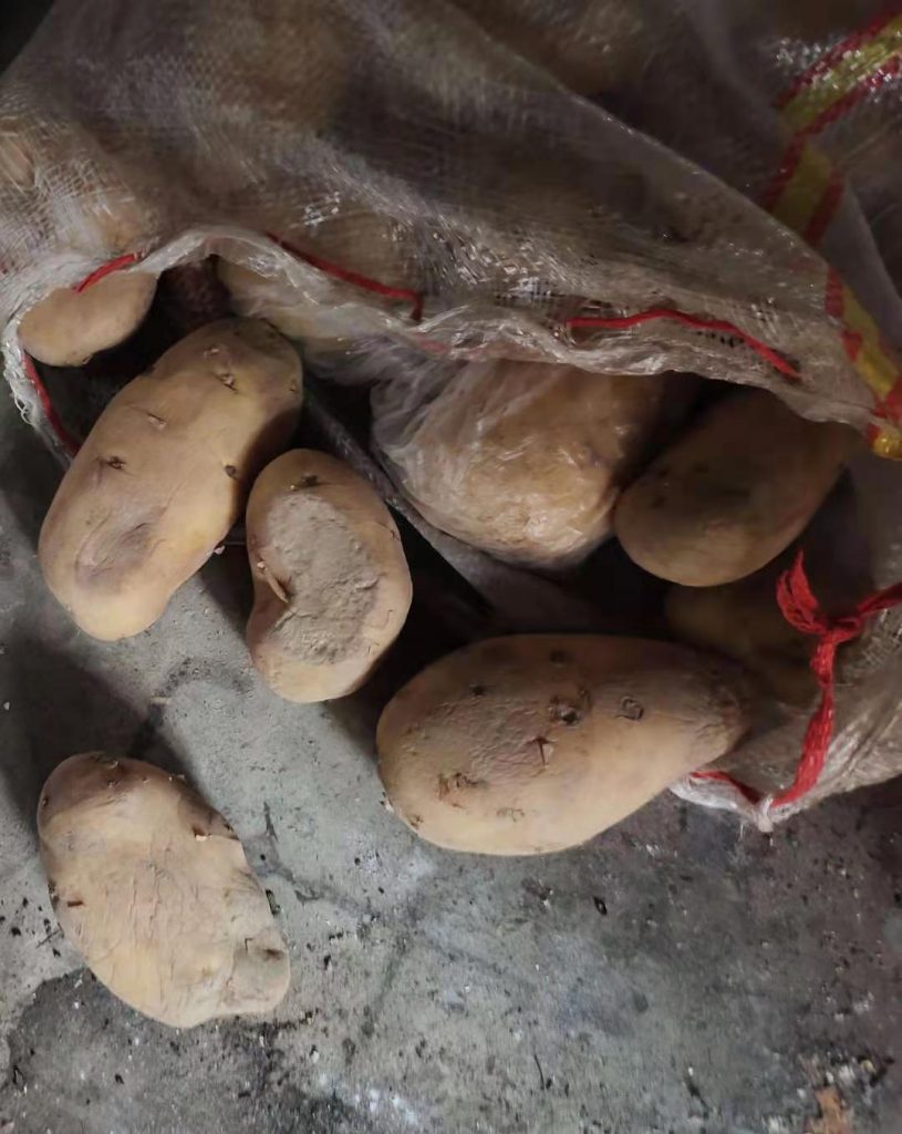 记者在地板上一个塑料框里看到后厨人员削下来的带有黑斑的土豆片,在一个存放土豆的袋子里,赫然发现已经腐烂变质的土豆,塑料框里削下来的土豆片就是从此来的。