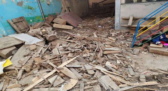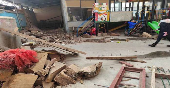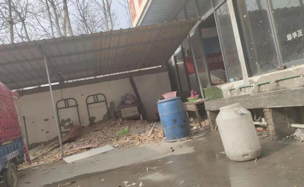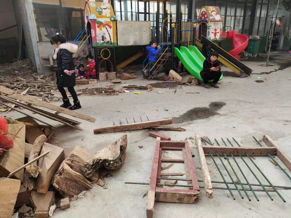 趁家长和学校负责人聊天机会,记者在校园内转了一下。校园活动场地很小,大概四五百平方左右,校园内污水横流,垃圾桶随便摆放,地上垃圾随地都有。校园西墙处彩钢棚下,堆满了玉米芯及杂物,如果光看到这一个角落,让人还以为是农家院农民存放的冬天用于烧火做饭的柴禾呢,怎么也不会和学校联系在一起,而且就在孩子玩耍的校园内。