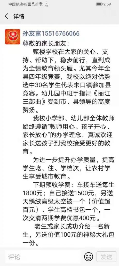 李先生提供的截图和收费证明显示,朱口镇甄龙学校孙校长从2020年12月18日在朋友圈里就开始宣传学校下学期收费通知,并把一家长微信缴费截图上传到朋友圈。同时李先生提供的还有学校多名老师转发在各自朋友圈和家长群里的收费通知的截图。