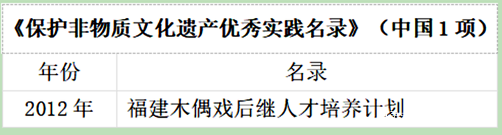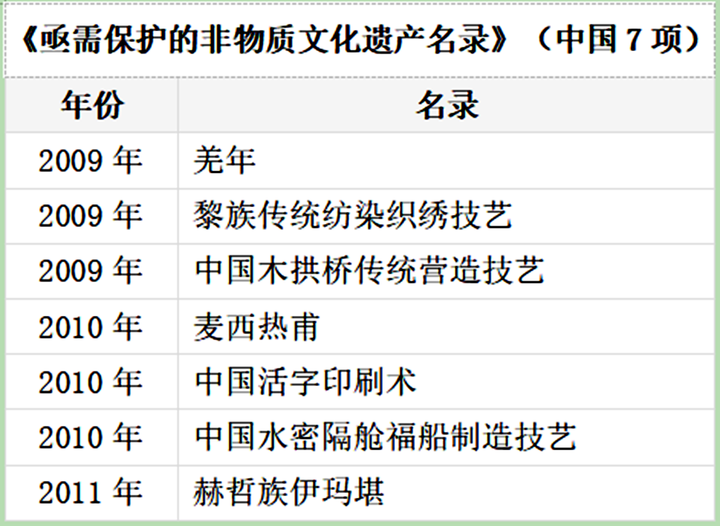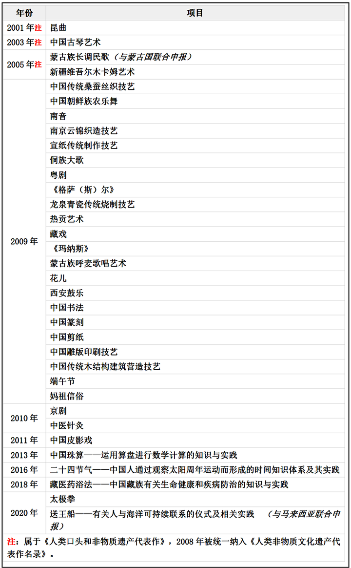 截至2020年12月,中国共有34个项目(含2个跨国联合申请项目)被列入联合国教科文组织《人类非物质文化遗产代表作名录》,7个项目被列入《亟需保护的非物质文化遗产名录》,1个项目被列入《保护非物质文化遗产优秀实践名录》。