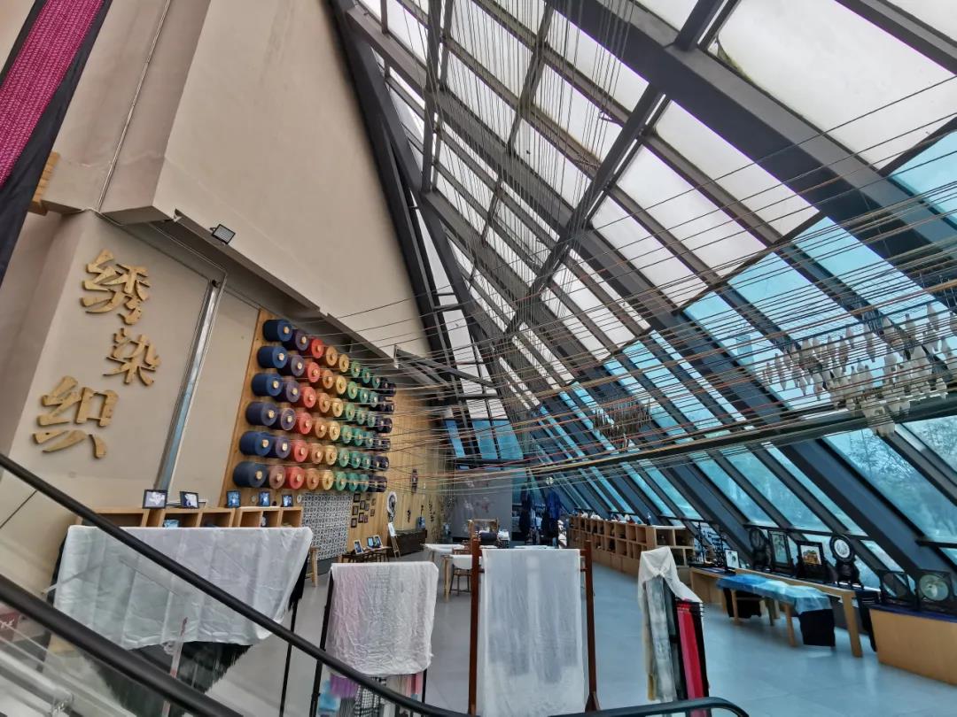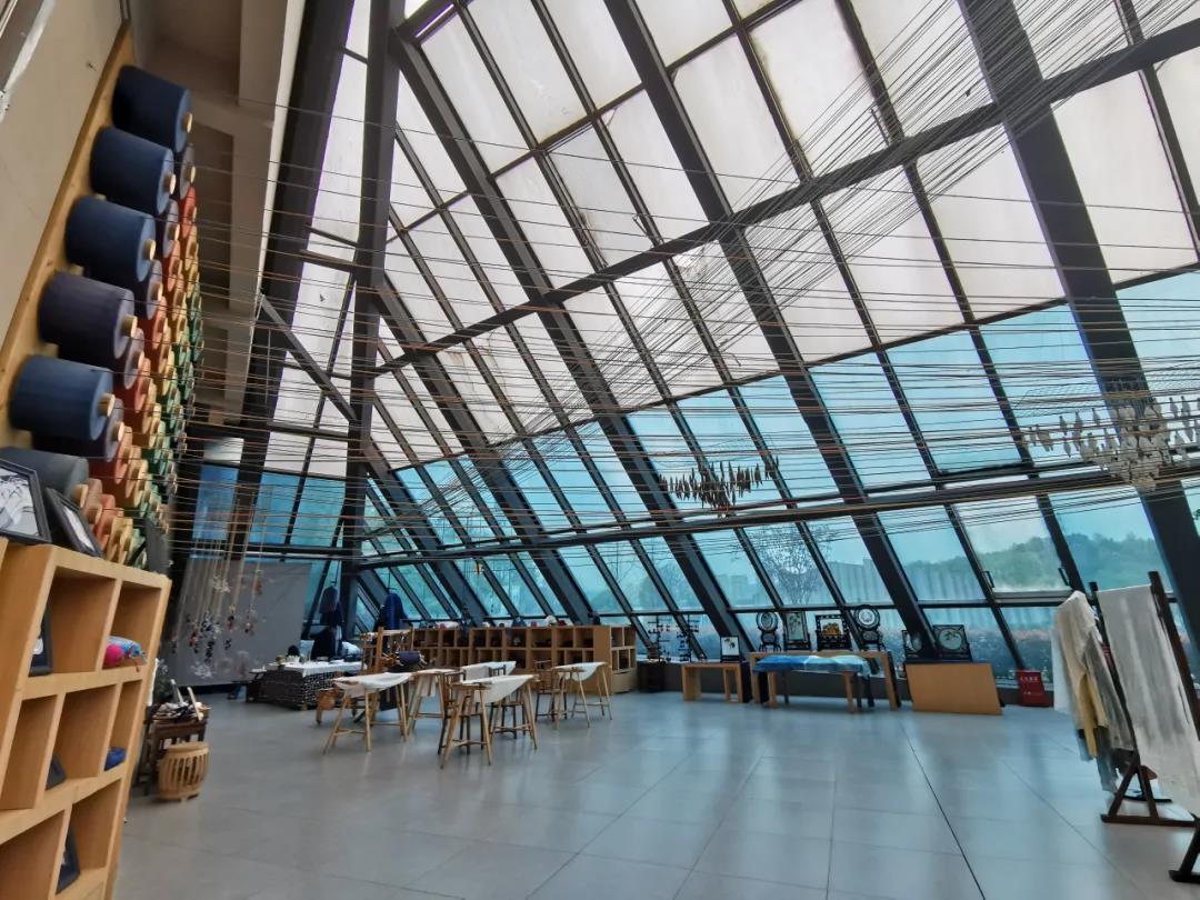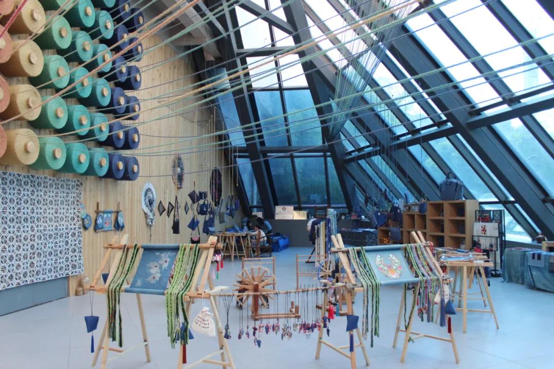 苗族是贵州民族服饰的精华所在,被称为“穿在身上的历史”。大椎体绣染织体验馆集民族刺绣、蜡染、纺织的展示、鉴赏、体验为一体,半金字塔形的高空中是多彩的丝线与巨幅绣片组合的壮美场景。馆内有各式手链、戒指、香包、手包等产品售卖。不仅如此,游客还可以在此参观非遗手工技艺作品,以及体验织布、刺绣的非遗技艺。
