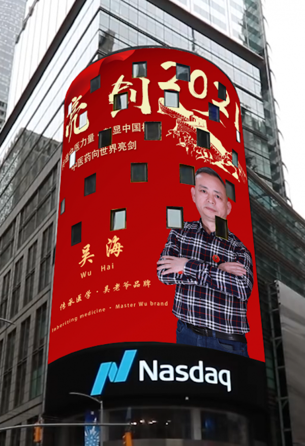 吴老爷品牌·活络保健液研发创始人、广西康泉健康产业有限公司董事长吴海,为中医药创新技术和发展作出了突出贡献,在2021年6月中旬受纳斯达克展播邀请,走出国门,荣登“世界第一屏”,向世界展示中医的力量与魅力。