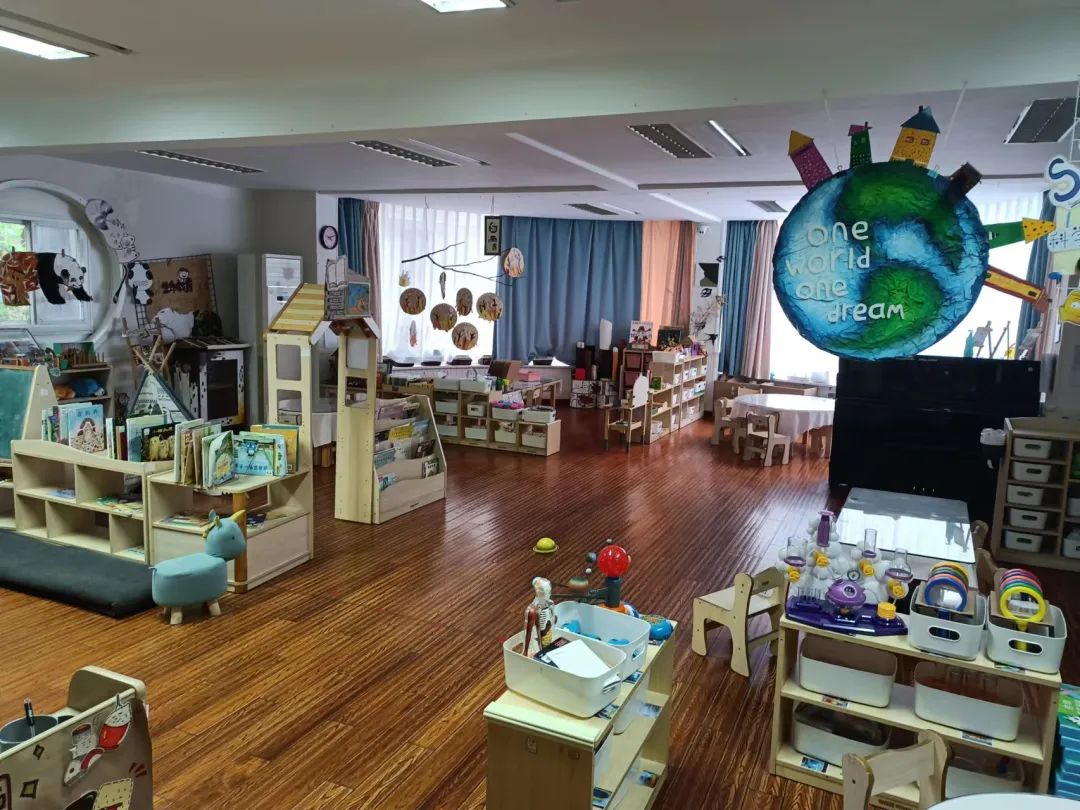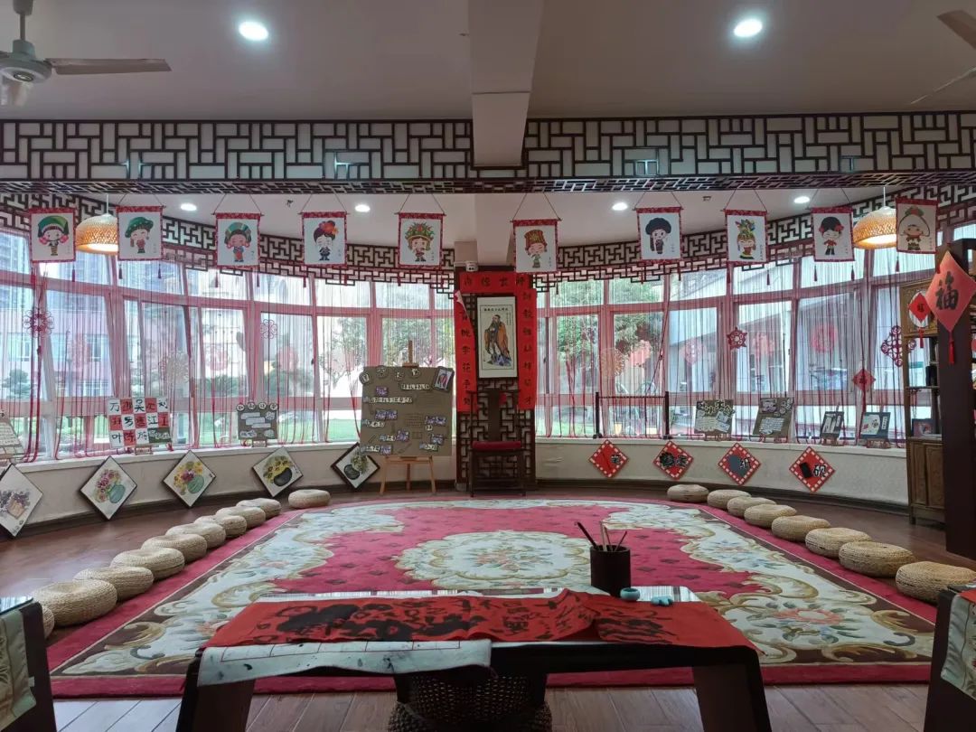 在国学馆里,笔墨丹青、蒲团案机,浸润着书香古韵,在中华元素的氛围中,让小朋友感受着中国古老的文化,学习中华千年传承的文明礼仪。大家在一个教室门口驻足,一位女外教正在手舞足蹈用英语演示,围成一圈的小朋友兴致昂扬举手互动,好一幅寓教于乐生动画面。