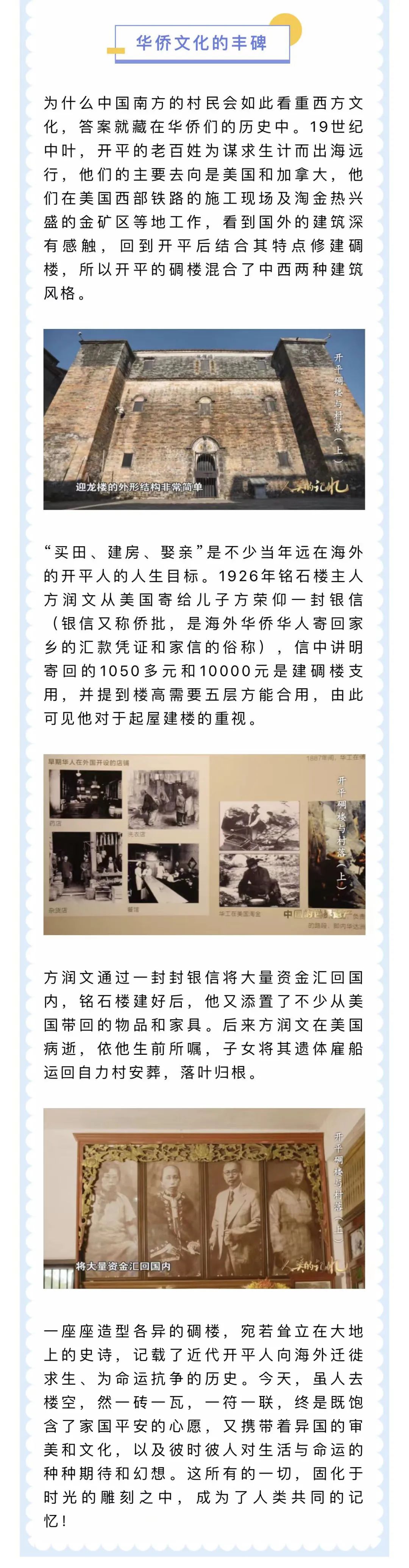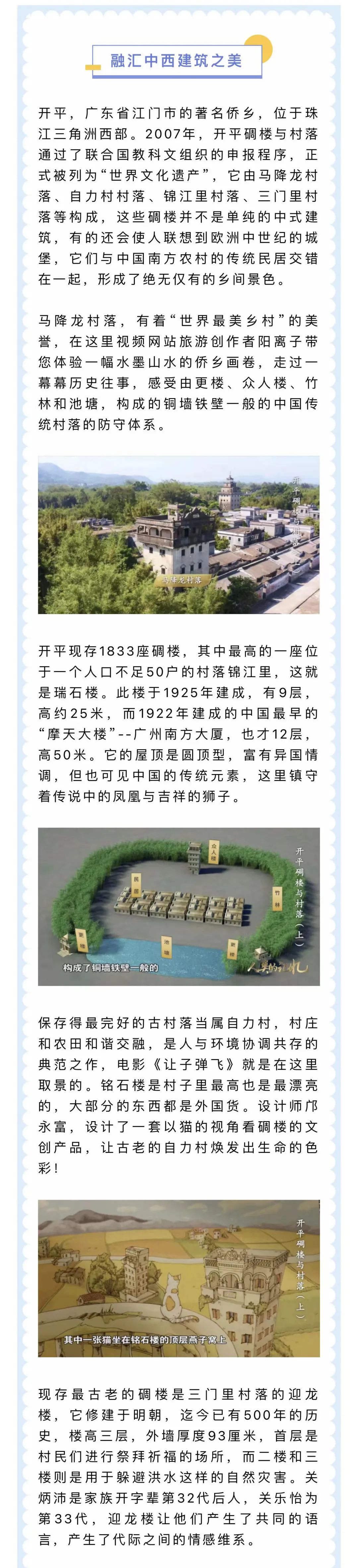 纪录片《开平碉楼与村落》由中共广东省委宣传部、中共江门市委宣传部、中共开平市委宣传部协助拍摄,由广东广播电视台对外传播中心(国际频道)团队承制。该片以锦江里、自力村、马降龙、三门里等村落的典型碉楼为切入点,讲述一个个碉楼背后的人物和历史故事,解读碉楼设计的特点和文化,以今天的理念、全球的视野全面聚焦开平碉楼与村落保护与传承的主题,重新审视和提炼中国的世界遗产的价值与意义,向全世界呈现文明交流互鉴的东方故事。