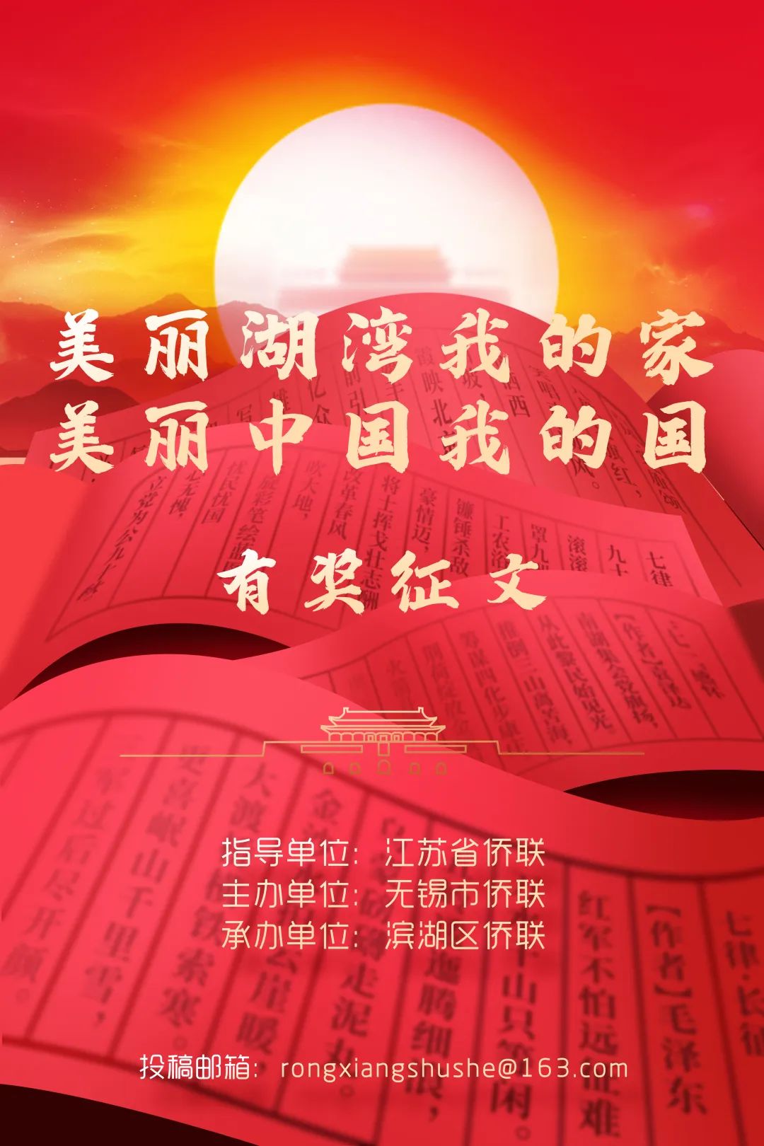鳞次栉比的高楼间人影攒动,高速运转的城市机器就在眼前:交通便利快捷,建筑别具特色,科技领先发达,人民生活惬意便捷,这里是高质量发展的无锡。夕阳红,那来势汹汹卷走回翔暮鸦的火烧云,瑰丽无比,喧闹的湖湾,渐归梦乡。眼前各色霓虹灯次第点亮,烟花在墨色长空盛放,以绚丽之姿闪亮湖湾。“湖色当月照”,滨湖的夜,开始了……何其有幸,生于无锡。何其有幸,住在滨湖。美丽湖湾,我的家。美丽中国,我的国!