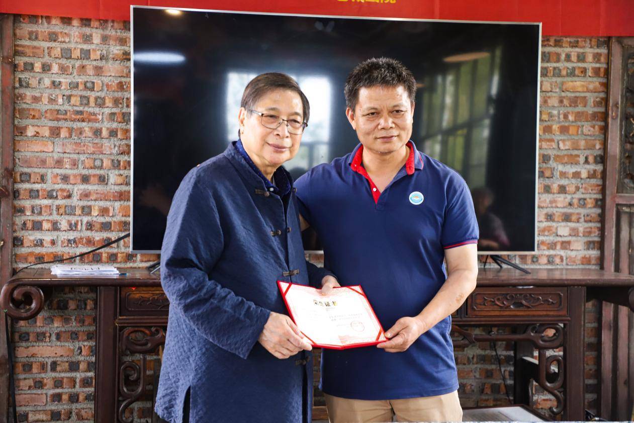 图为开平仓东非遗文化保育中心向司徒乃钟先生(左)颁发捐赠证书