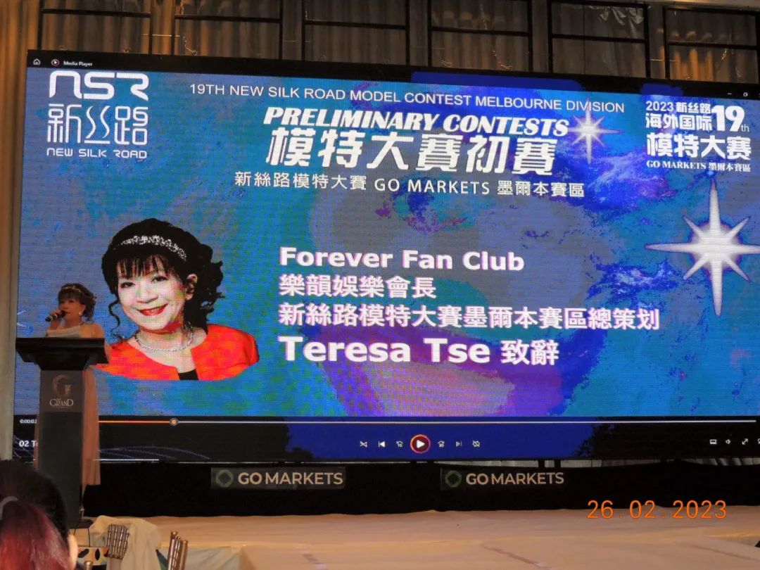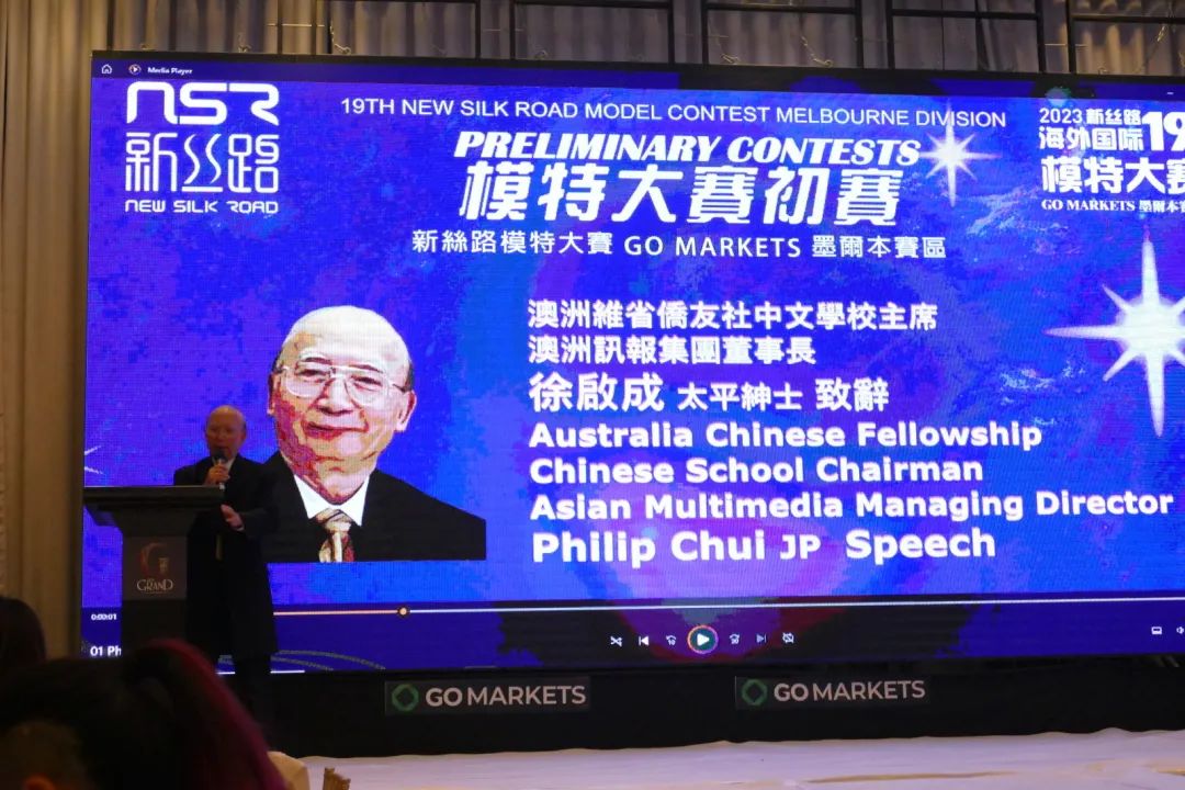 澳洲讯报集团董事长徐启成太平绅士首先致感谢词,他提及这次与新丝路和澳中经济科技文化促进会的合作是一个缘份,期望这次的合作,给中澳做好一个新的交流桥梁,日后每年举办,变成一个澳大利亚文化活动的品牌盛事。他感谢好友和商界团体的拥护和爱戴,金融名牌GO MARKETS成为墨尔本,悉尼赛区的总冠名机构,Y Model国际时尚模特学院和百花舞蹈(Bloom Dance Studio)合作机构鼎力支持,并得到乐韵娱乐为总策划和其他商界侨领和友好的鼓励。他在此代表澳洲讯报集团再次感谢新丝路产业集团和澳中经济科技文化促进会,总冠名GO MARKETS,Y Model国际时尚模特学校校长于惠子老师(大会评委),Bloom Dance Studio百花舞蹈创办人Ms Cherry Sun(大会评委),赛埸总策划乐韵娱乐,协办机构富力地产,The Grand On Princes,到场嘉宾,中外传媒,和本报一班好拍档和工作人员包括Johnny Leung,Alva Leung,Michael Tse,Teresa Tse,John Ho,William Yip,TV制作Danny和Jenny Fung,专业摄影团队Jonathan和Kelly Ho等等齐心协力做好这活动,非常感谢!