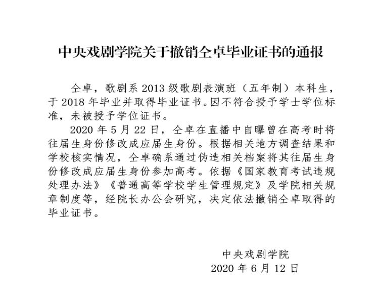 中央戏剧学院:未授予仝卓学位证书 撤销其毕业证书 中国记录新闻网 2032文章 2评论 2020-06-1218:19:32新聞中心评论23,0631字数 55阅读0分11秒阅读模式 中国记录通讯社快讯 据中央戏剧学院网站消息,6月12日,中央戏剧学院发布关于撤销仝卓毕业证书的通报。 全文如下: 历史上的今天6 月122023四川省侨联2023年海外侨领研修班、2023年联谊联络工作专题培训班在绵开班2022著名作家叶辛当年下乡之地,贵州省未来研究会来修文考察2021热带低压横穿海南岛加强为台风 13日将登陆越南 1 登录收藏 https://www.hiknews.com/information/2020/06/12/16529.html 复制链接 复制链接