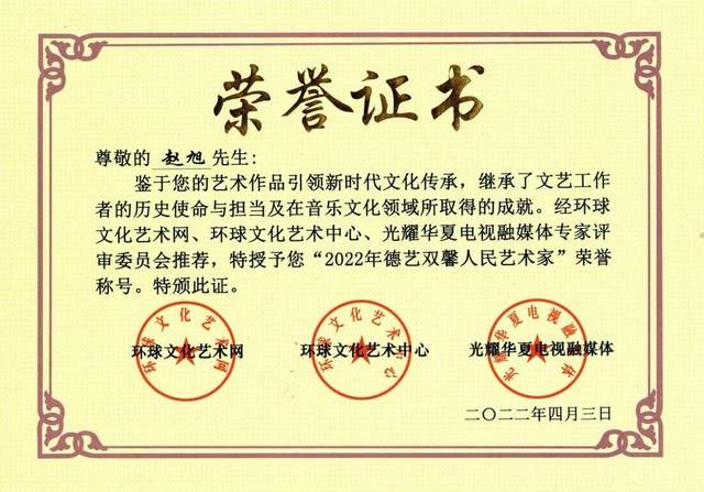近日,经环球文化艺术中心、环球文化艺术网、光耀华夏电视融媒体专家评审委员会推荐,特授予赵旭先生“2022年德艺双馨人民艺术家”荣誉称号。