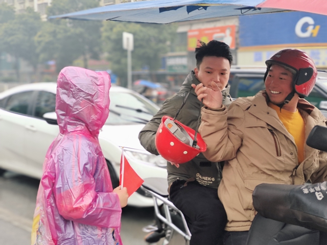 绵绵细雨中,孩子们戴着红袖章,手拿小红旗,排着整齐的队伍,迈着统一的步伐,分赴各交通要道口值勤。“叔叔、阿姨,骑车要佩戴好头盔,生命安全第一!”“奶奶请不要闯红灯,要文明过马路……”。“小雷锋”们挥舞着红旗,不停的劝导着一些雨中急行的路人,在大家的劝导下,路人都耐心地等候着,不少摩托车司机佩戴好头盔,交通秩序井然。