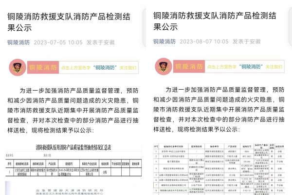 为进一步加强消防产品使用领域监督执法规范化建设,确保消防产品和消防设施完好有效,预防和减少因消防产品质量问题造成的火灾隐患,近日,铜陵市消防救援支队长期开展消防产品抽样送检工作,并将检验结果公开公示,严格监督消防产品质量,切实净化消防产品市场秩序。