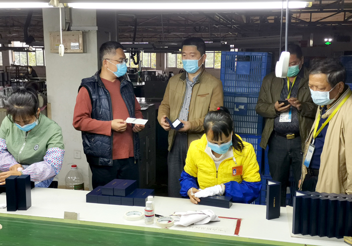 海南省侨联党组成员李诚(左3)在万达包装厂调研了解企业复工复产情况 林道程 摄