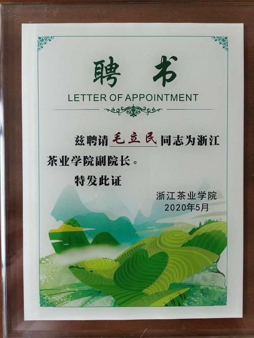 蒋珍贵副秘书长为浙江茶业学院院长周文根、执行院长张士康、副院长毛立民、童铧彬颁发聘书。