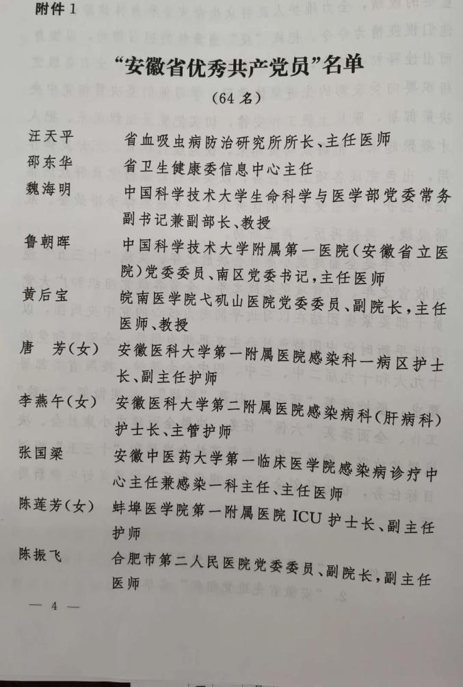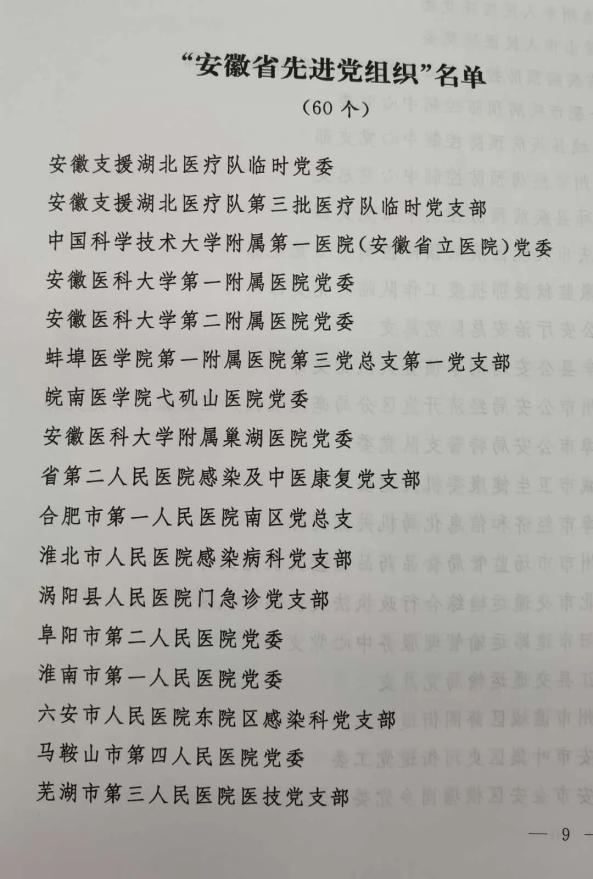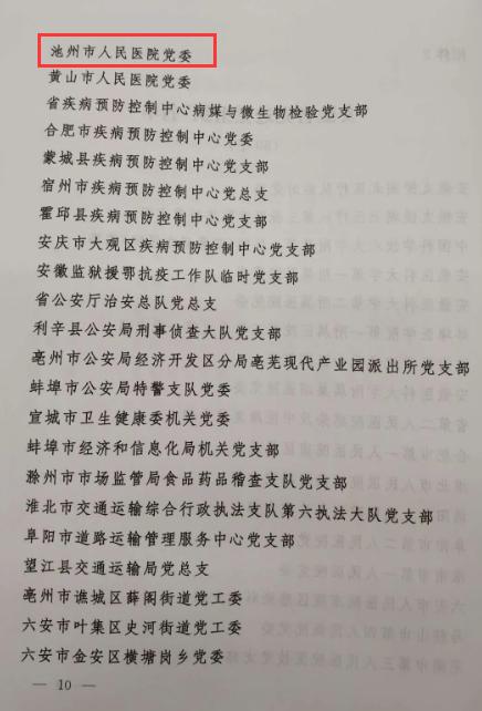 6月30日上午,安徽省庆祝建党99周年暨疫情防控中涌现的优秀共产党员和先进党组织表彰会议在合肥召开。会上宣读了《中共安徽省委关于表彰“安徽省优秀共产党员”“安徽省先进党组织”的决定》。其中,池州市人民医院党委荣获安徽省先进党组织称号,陈浩、李强、张谦荣获安徽省优秀共产党员称号。