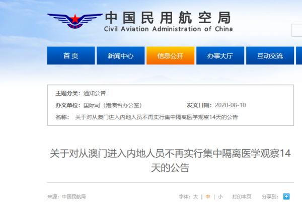 为统筹做好疫情防控和恢复内地与澳门人员正常往来工作,自8月12日零时起,对从澳门进入内地人员不再实行集中隔离医学观察14天。现将有关事项通告如下: