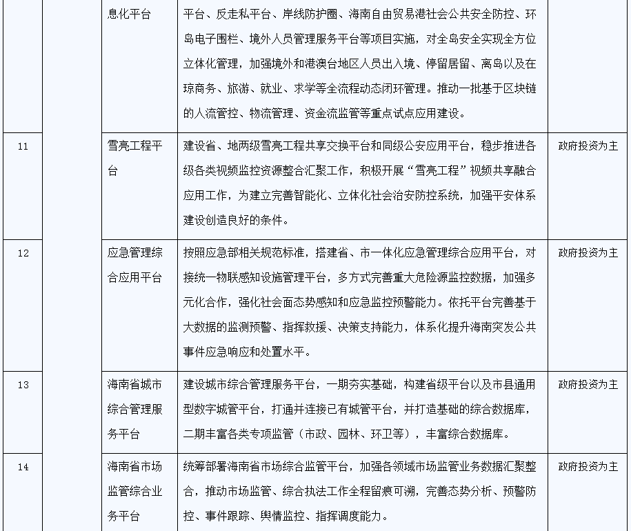 完善多维感知立体化安防体系。加快推进智能门禁等多维感知前端和采集系统布设,实现技防设施深度覆盖。推进“雪亮工程”建设全面覆盖到社区(村),依托海南省公共安全视频监控建设联网应用总平台,建设省、地两级雪亮工程共享交换平台和同级公安应用平台,全面整合现有视频资源,支撑社会管理信息化平台。建设移动安防管理系统,实现警务实战效能与队伍管理效能的同步提升。建设海南警务大数据分析平台,加速警务工作智能化进程。加快推进公安情指行一体化指挥体系建设,实现指挥调度可视可控、指挥决策高效智能。加快推进立体化、信息化社会治安防控体系建设,加快数据警务、智慧公安建设提档升级。完善网络空间安全管控防护体系,促进网络空间舆情监测、分析研判、管控体系智能化、规范化运行。(牵头单位:海南省、公安部)
