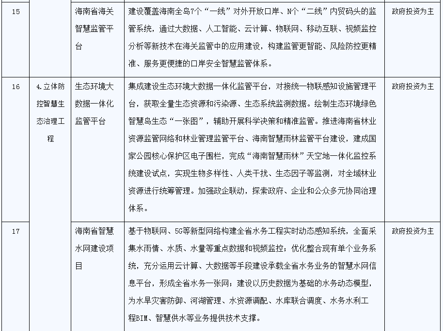 完善生态环境全要素监控体系。对接统一物联感知设施管理平台,按需申请调用全域全门类生态环境要素监测数据。建设生态环境大数据一体化监管平台,全面覆盖城乡区域,打造“绿色智慧岛一张图”。搭建海南省林业资源监管网络和林业管理监管平台,健全林长制,实时可视化掌握海南林业生态的最新动态。以海南热带雨林国家公园为载体,建设海南智慧雨林监管平台,实现对自然资源和生态环境的全要素管理,推动海南热带雨林生态监管和自然保护高效联动。加快智慧水网信息平台建设,构建物联网体系及水资源调配、水库联合调度、水务水利工程BIM、孪生数字工程、智慧供水等特色应用,完善海南省河长制平台,打造水务水利信息实时感知、水文水资源智能监控、数据融合互联、业务管理协同高效、全民共享水服务的体系。(牵头单位:海南省、生态环境部、水利部、林草局)