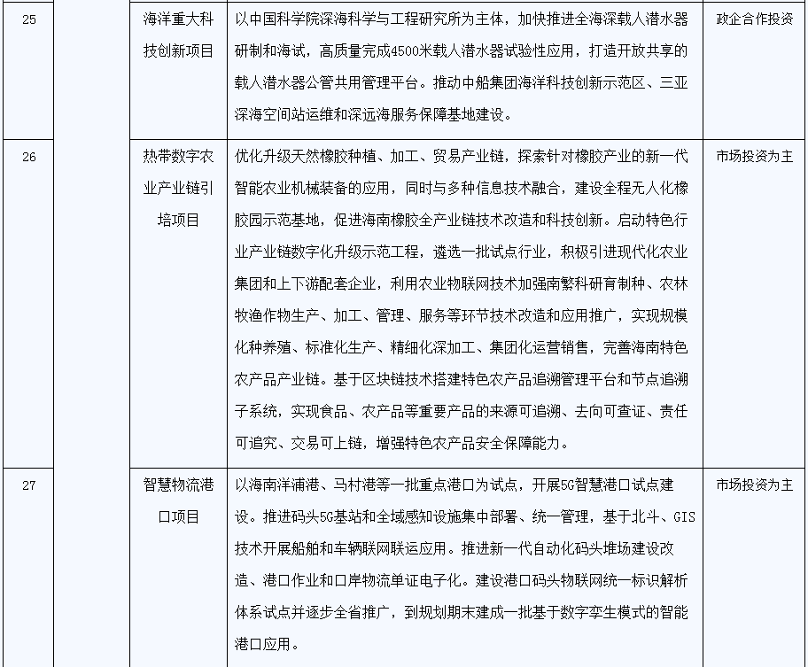 推动海洋产业重大科技创新。依托三亚深海科技城等创新基地,实施海洋信息化重大科技项目,完善海洋服务基础设施,积极发展海洋信息服务,发展壮大海洋环境感知、港航(海事)管理、船用电子等产业。发展海洋观测、北斗服务、海洋灾害及生态监控预警等服务,加快推进海南环岛及西沙、南沙典型海域综合信息应用示范。建设互联网+海洋牧场,加强渔船定位、通讯、导航和渔港综合管理信息化建设,提高渔业管理和控灾减灾能力。发展互联网+海洋能源产业,搭建海上风电创新平台,加强波浪能装备创新和示范应用,拓展基于大数据的勘察设计、模拟仿真、机组运维、装备智能制造等新业态。(牵头单位:海南省、发展改革委、农业农村部、自然资源部、科技部、中科院)
