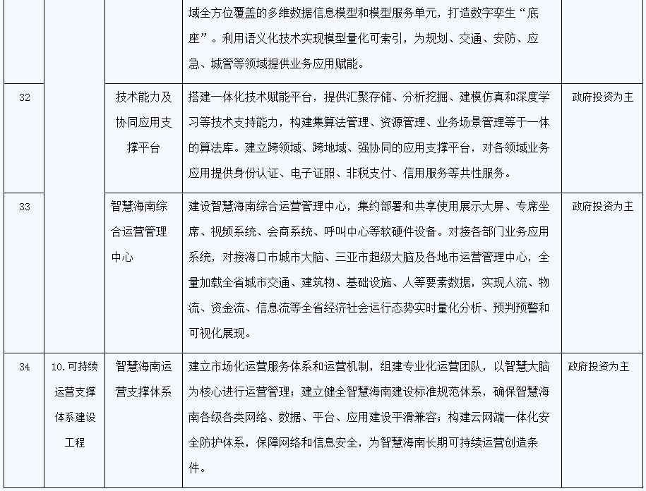 建设海南省级智慧大脑。推动海口、三亚地市城市大脑建设,加快城市治理、环保水务、应急指挥等领域创新应用。依托海南省数据大厅,建设海南省级综合运营管理中心(海南省智慧大脑),对接各地市级运营管理中心和城市大脑。基于海南省智慧大脑推动全省各地区总体态势、运行管理、综合服务、分析决策、重大项目等“一屏感知”,提升突发应急状况下全省跨层级、跨部门决策智慧和资源调度能力。(牵头单位:海南省、发展改革委、工业和信息化部)