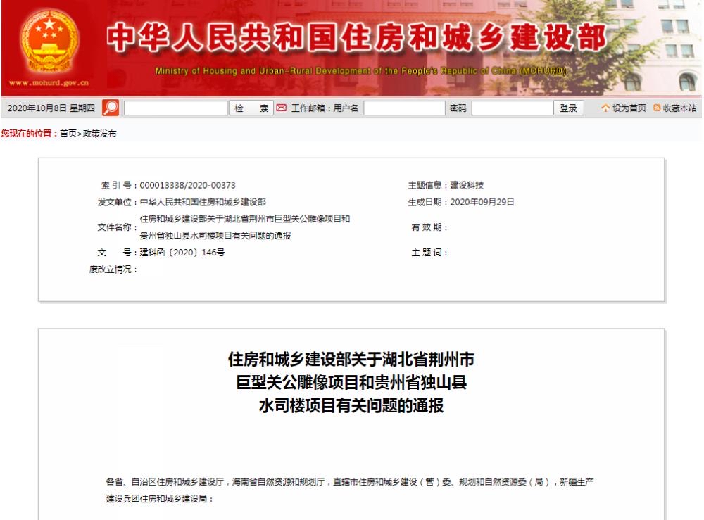 近期,我部会同有关部门对媒体和群众反映强烈的湖北省荆州市巨型关公雕像项目和贵州省独山县水司楼项目进行了调查。为切实加强大型城市雕塑建设管理,坚决治理滥建巨型雕像等“文化地标”现象,现对湖北省荆州市巨型关公雕像项目和贵州省独山县水司楼项目予以通报。