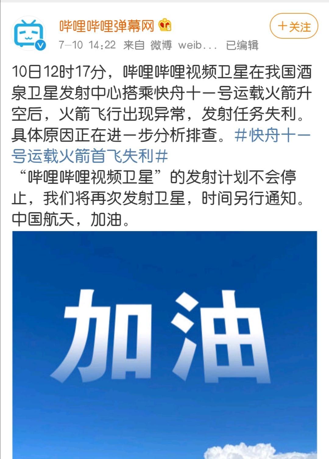 7月10日,针对“快舟十一号运载火箭首飞失利”一事,哔哩哔哩回应称:“哔哩哔哩视频卫星的发射计划不会停止,我们将再次发射卫星,时间另行通知。中国航天,加油。 ”