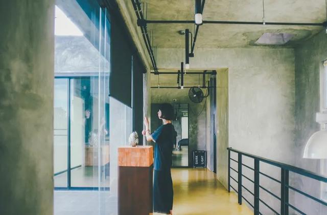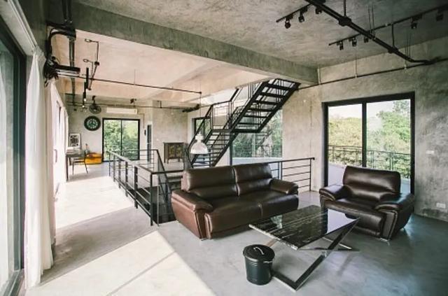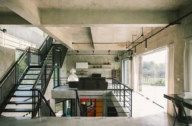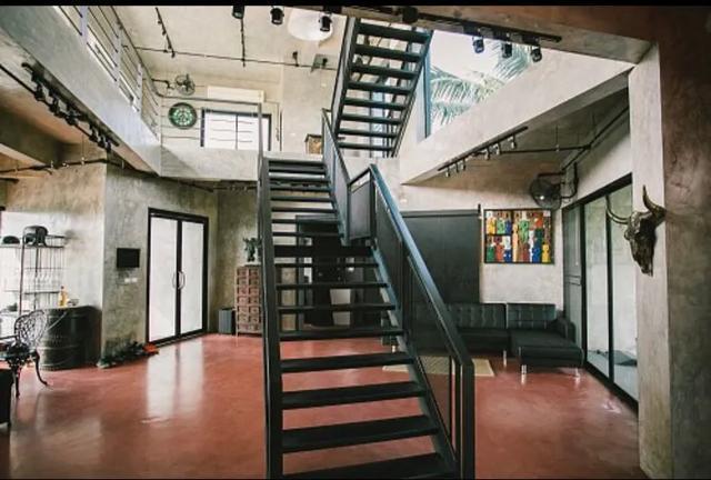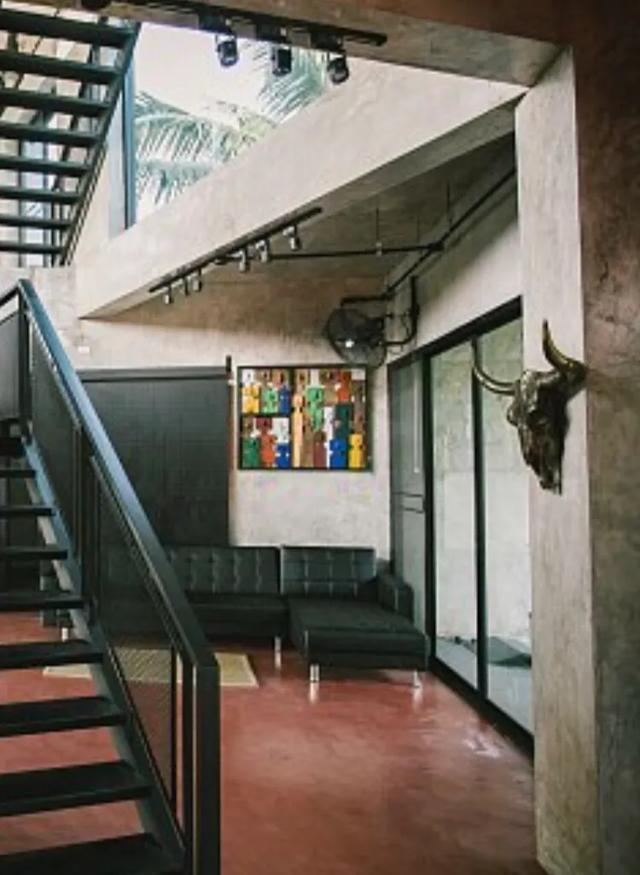 黑色铁艺楼梯,水泥墙,周边横梁直接裸露在外,地面是很多仓库都用到的彩色自流水泥地,整体很粗狂,外表冷峻,却酷感十足。