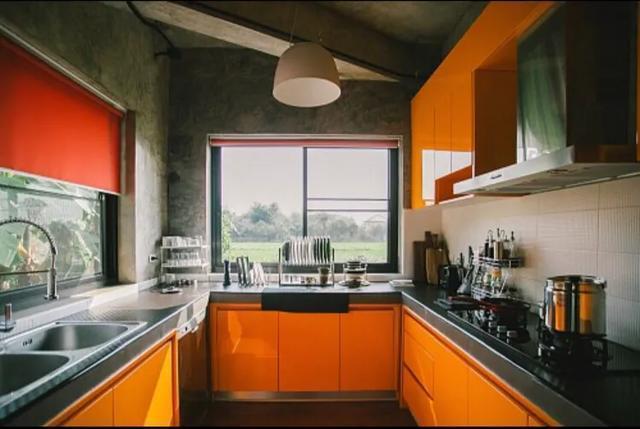 厨房橙色的橱柜,让整个空间都显得十分鲜亮,搭配女主亲自挑选的锅碗瓢盆,瓶瓶罐罐等厨房器具,这个厨房不仅亮眼,还超级好用。