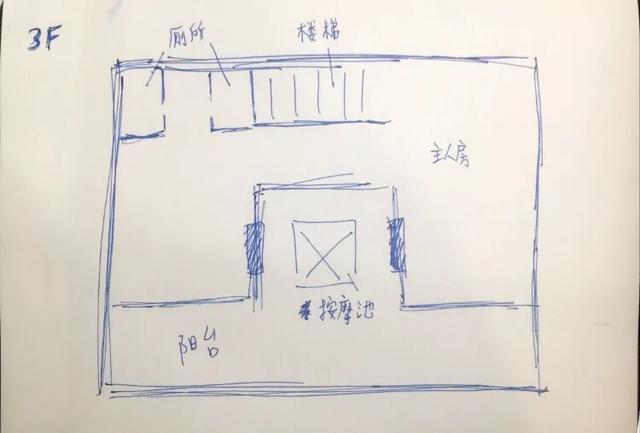 通过这张手工绘图,我们先来看看一楼布局,餐客厅独立厨卫,外加两卧室。右边是私人车库。