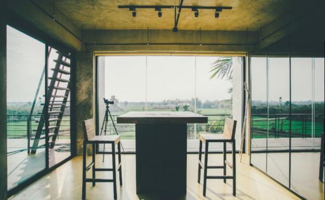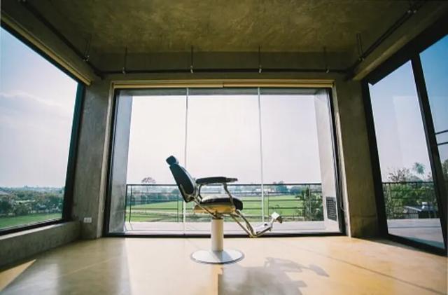 三楼是这个家里风景最好的地方,加上框架结构的房子每一面都有大大的落地窗,躺在床上就能将户外风景尽收眼底。一张用于理发店可360度旋转与调节高低的椅子被屋主搬进了卧室,放在床尾的落地窗前,早起看日出,傍晚看日落,美哉!