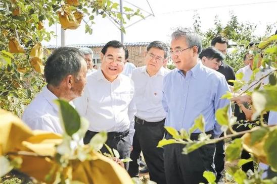 6月5日至7日,中共中央政治局委员、国务院扶贫开发领导小组组长胡春华在陕西省实地督导脱贫攻坚工作。图为他在延安市延川县梁家河村考察山地苹果种植情况。记者 张辰摄