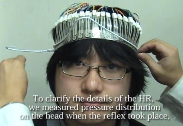 研究人员首先在实验者的头上安装了能够测量力大小的传感器,并且将衣架套在受试者的头上,测量衣架给头部所施加力的分布和大小。
